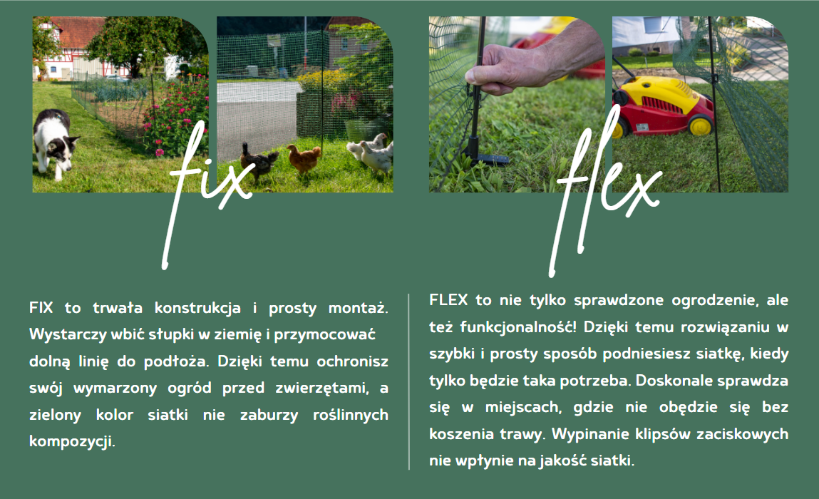 - FLEX – elastyczna siatka, którą można łatwo przenosić i dostosować do zmieniającego się układu ogrodu.